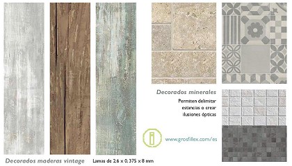 graphic, madera rústica azul y marrón) y 3 modelos minerales (cemento, mosaico y travertino). La reproducción de los materiales naturales se consiguen vía impresión digital, sobre la que se añade