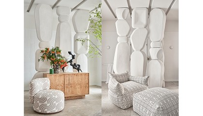momento más íntimo e incorpora el inodoro y el bidé suspendidos de la serie Nexos de la colección Lavi. El inodoro aparece acompañado del pulsador wc suspendido blanco de la colección.
