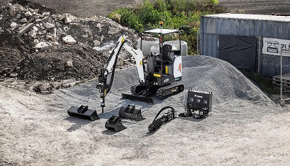 limpiadores de agua de alta presión, plataformas de trabajo, trituradoras de residuos vegetales e incluso transplantadores de árboles. Minicargadora Bobcat S70 equipada con un martillo demoledor. Módulo de control de implementos