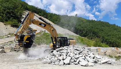 piedra serena y piedra alberesa, encontró en la cuchara BF120.4 la solución perfecta para transformar sus residuos en un recurso útil: con el material triturado repara sus pistas sin depender