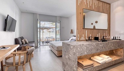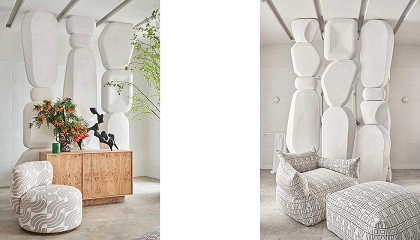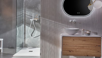 rociadores redondos, en blanco y con los detalles en madera en pulsadores, manetas y remates de las bandejitas incorporadas para apoyar geles o champús característicos de la colección Lavi. En líneas