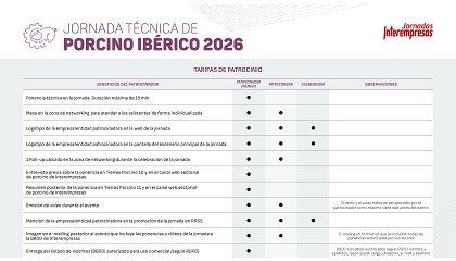 Técnica de Porcino Ibérico 2026 - 16/01/2026: Ventajas de patrocinar la Jornada Técnica de Porcino Ibérico 2026 Conexión directa con el productor ibérico . Participar en la jornada permite a las empresas