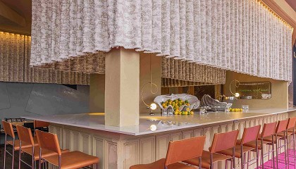 telas. Las mesas y la barra del bar son las piezas únicas que daban vida al restaurante, creadas con superficies de Alvic, combinando colores sólidos y acabados que recrearon los mármoles