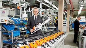 tronzadora de acumulador La presentación oficial de los datos del Grupo concluyó con la presentación mundial de dos grandes novedades –la primera tronzadora de acumulador y la primera motosierra desarrollada