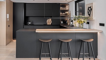 vitrina retroiluminada y una barra de desayuno, así como el pavimento en tarima roble. Los tonos naturales contribuyen a suavizar la dureza del negro, dando como resultado un ambiente muy confortable