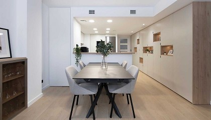 vitrina de cristal, para guardar copas y vasos. Para el comedor se ha optado por una mesa en negro y sillas tapizadas en gris, en contraste con el resto de tonalidades