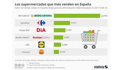 Alcampo y Simply) con 4.600 M€ aproxidamamente; Lidl con casi 3.600 M€ y Consum , algo más de 2.500 M€. Statista advierte que no obtuvo los datos de Eroski en España