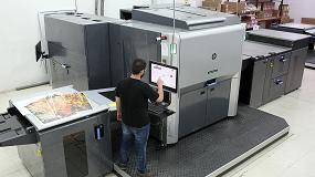 Indigo 30000, con unidad de imprimación integrada capaz de imprimir en cuatricromía cartones de hasta 450 g/m². La barnizadora en línea Harris & Bruno ExcelCoat ZR30 aporta eficiencia en la fase