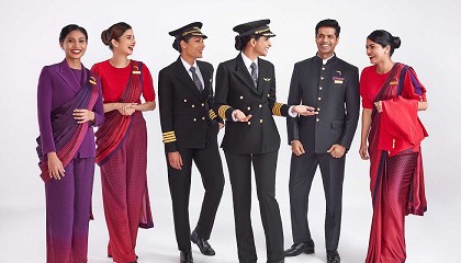 bordo - 04/01/2024: La tripulación de cabina de Air India luce saris y bandhgalas ombré diseñados por Manish Malhotra Los nuevos uniformes de Air India dan la bienvenida a la alta