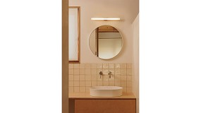 cepillado, material poco habitual en el baño y que aporta una identidad diferenciada. La maneta, inspirada en la forma de una gota de agua, refuerza visualmente el mensaje de eficiencia