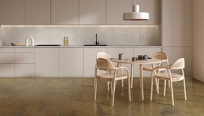 dorados envejecidos genera matices cambiantes a lo largo del día, transmitiendo una sensación de lujo sereno y contemporáneo. Más que un acabado metalizado, se trata de una textura que capta