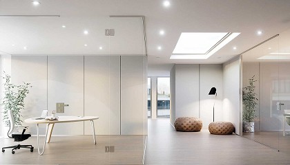 resultado es una luz indirecta que proporciona un alto confort visual. Con el arco enrasado y una pantalla de color dorado, la luz cálida de Lámina Dorada ofrece una atmósfera de intimidad.