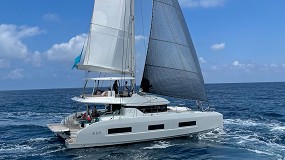 fregadero y nevera, mesa de teca plegable con funda y el puesto de mando cuenta con control remoto. El ADN Lagoon se mantiene en 55 pies con un velamen aumentado