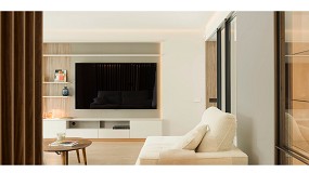 mobiliario elegante con tapicerías claras, contrastadas con detalles en negros en los tejidos y lacas. En las zonas más privatizas de la vivienda destaca el cuarto de baño de la suite