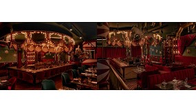 molduras de madera, domina el espacio. Una vez más, remontándose a los orígenes del circo italiano, la comedia y el teatro, el estudio se ha inspirado en las formas geométricas