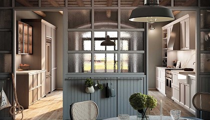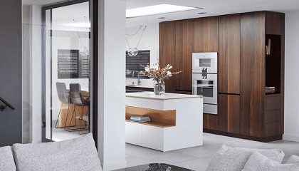 moldura biselada de roble natural enlaza la encimera con la base, lo que aporta un aire de sofisticación. Al final de la isla, una zona de comedor completa todo este