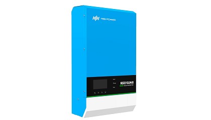 onda sinusoidal pura, un cargador de baterías, un regulador de carga solar MPPT y un relé de transferencia automática de alta velocidad bajo una carcasa compacta, con un display de diseño