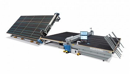 grúa puente automática Dynamic Crane. Macotec presenta en el mercado con una idea innovadora: una grúa puente que permite cargar hojas de vidrio muy rápidamente y administrar hojas grandes, medianas