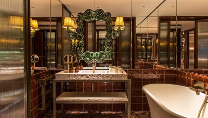restaurantes, bares, un gimnasio, una suite de bienestar y un club social, salas para eventos y un vestíbulo de dos plantas con un atrio ajardinado. A nivel de la planta
