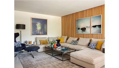 roble natural que aporta calidez y cohesión al espacio. El salón se organiza en torno a un gran sofá en forma de L, tapizado en tejido suave color arena y complementado