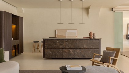 roble teñido, un material noble con un aspecto natural y sofisticado, combinado con un revestimiento de MDi de Inalco. Esta unión garantiza solidez, resistencia y refinamiento en cada detalle. El acabado