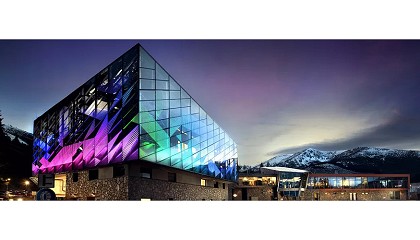 grafismos impresos en color blanco que añaden profundidad a la fachada de vidrio óptico. Pero cuando cae la noche, la fachada iluminada del edificio se transforma en un crisol de colores