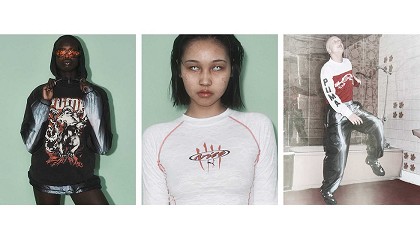 grafismos especiales. Entre los accesorios destacan la gorra y la bandolera. Para el calzado, Pleasures reinventa la nueva silueta de Spirex, un diseño asimétrico que se inspira en las zapatillas