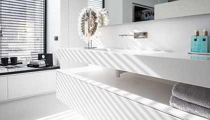 HI-MACS® Alpine White Elementos de HI-MACS®: Cuarto de baño: bañera Cleopatra, lavabos y cajones. Cocina: estanterías Créditos de las fotografías: © Daniel Nicolas Fuente: HI-MACS® Visitar la web de