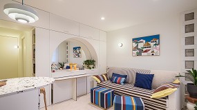 pufs, adaptándose al ritmo del huésped. Un detalle clave es el arco con espejo en el centro de esta estructura, un gesto visual que rompe la linealidad y aporta profundidad