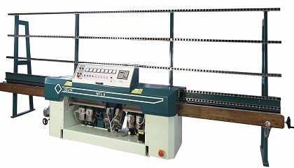 VDM 1636 CN con doble cabezal y almacén de herramientas rotativo (8+8 posiciones). El fresado se realiza mientras el vidrio está en una posición fija para lograr una mejor
