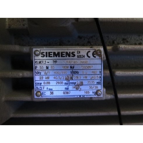 | Detalles | Motor patas, marca: Siemens, potencia: 22 kw a 2930 rpm . |