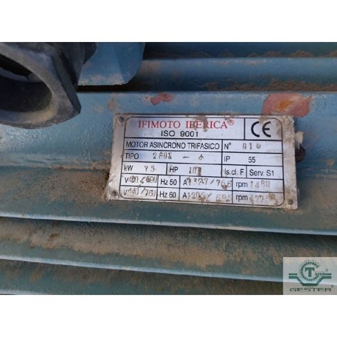 | Detalles | Motor brida: 75 Kw (100 cv), 1480 rpm, marca: Ifimoto Ibérica, 380 V. Corriente alterna CA. |