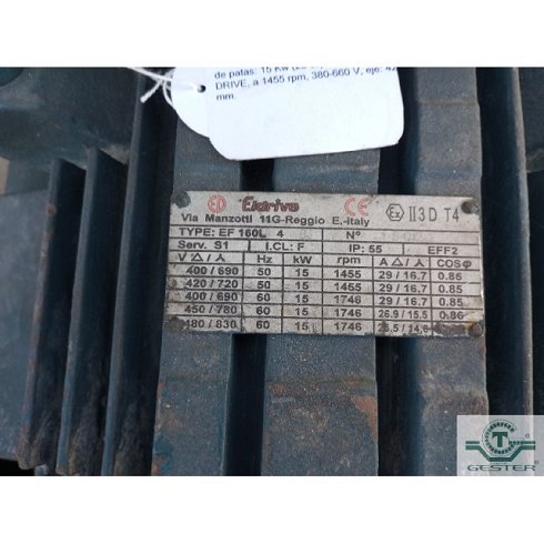 | Detalles | Motor de patas: 15 Kw (20 cv) marca: EL DRIVE, a 1455 rpm, 380-660 V, eje: 42 mm. |