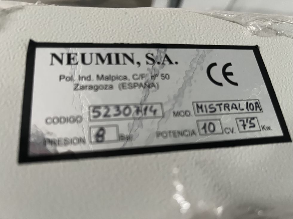 | Detalles | MISTRAL – serie 10-A: Compresor de tornillo insonorizado con arranque estrella-triángulo año 2007 - Nº serie 5230714 – horas trabajo: 350 horas - Características: presión máxima 10 bares potencia: 10 cv – 7,5 kw - 380v – 50 hz peso 238 k - Nivel sonoro: 65 db - Caudal: 1.337 l/m – 80,2 m3/s rpm: 968 - Medidas: 1060x690x1050 - Depósito exterior 500 litros – año 2007 - Secador/refrigerador final EDE-3 EDELWEIS – año 2007. Si necesita factura se la podemos hacer cargando el correspondiente IVA. |