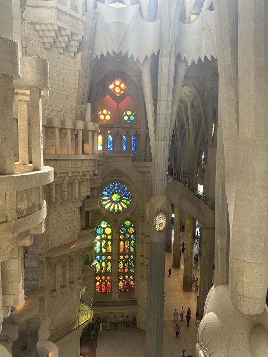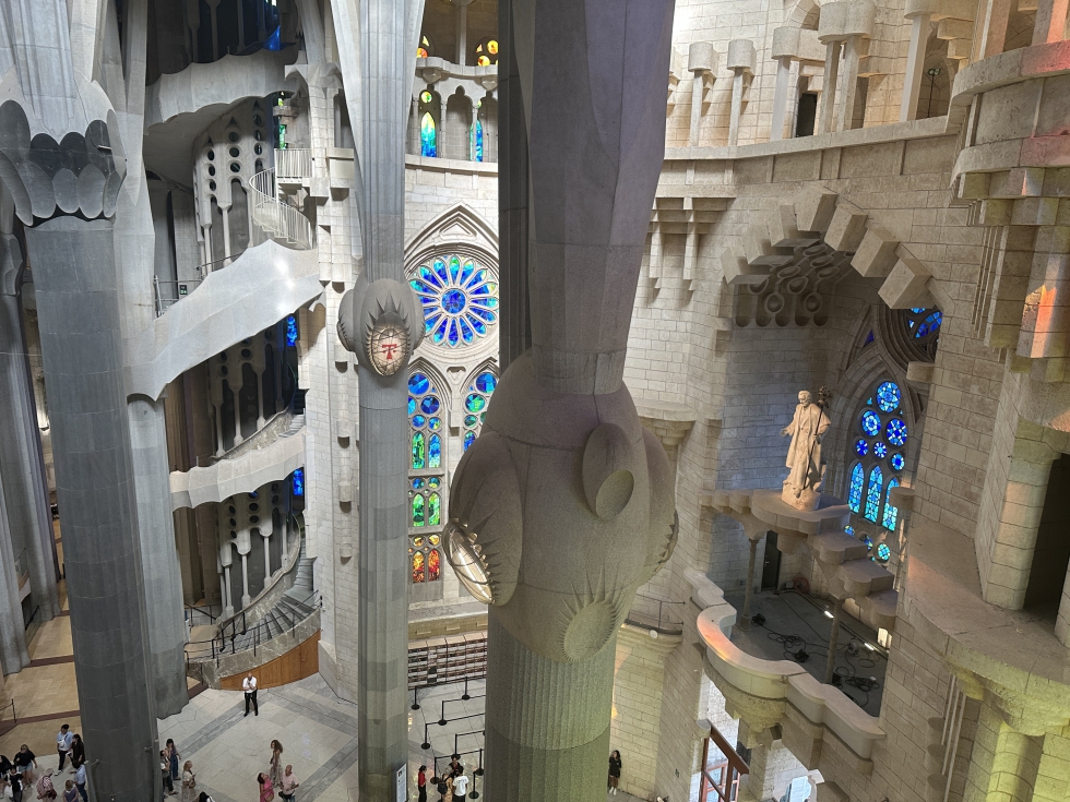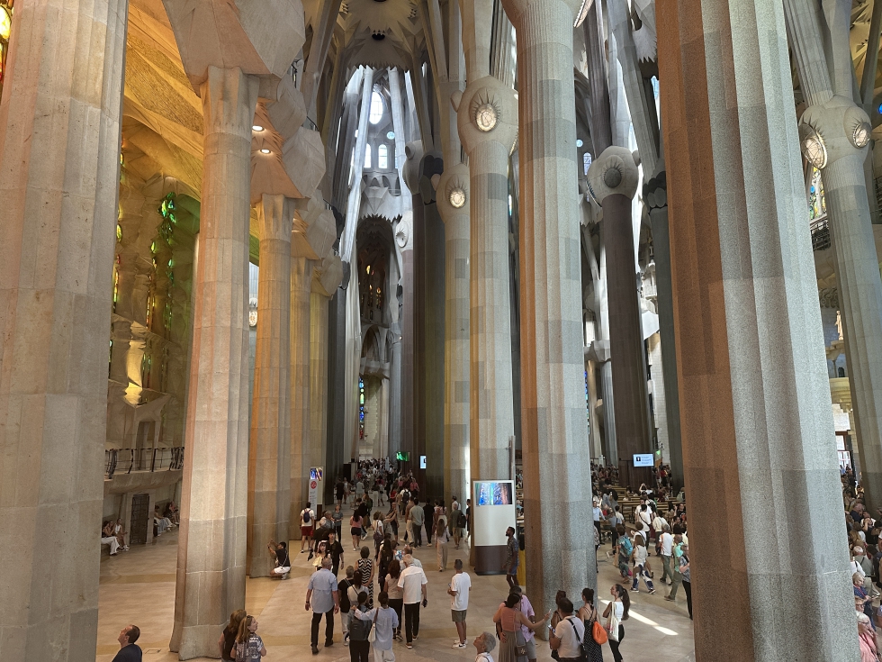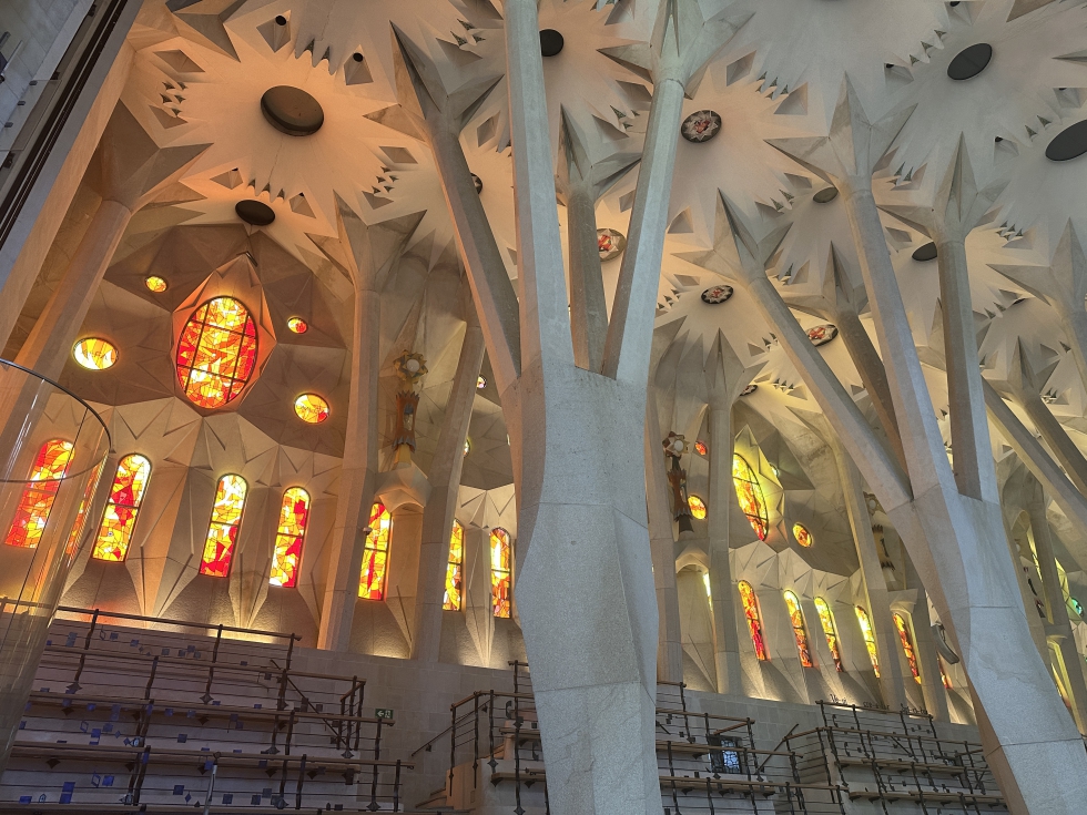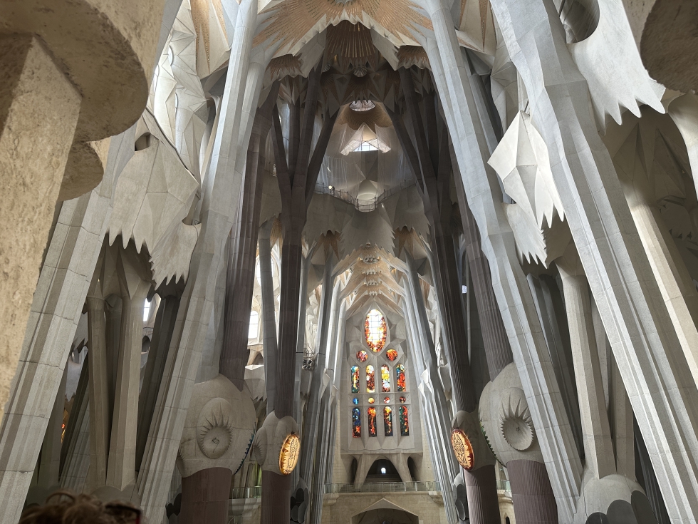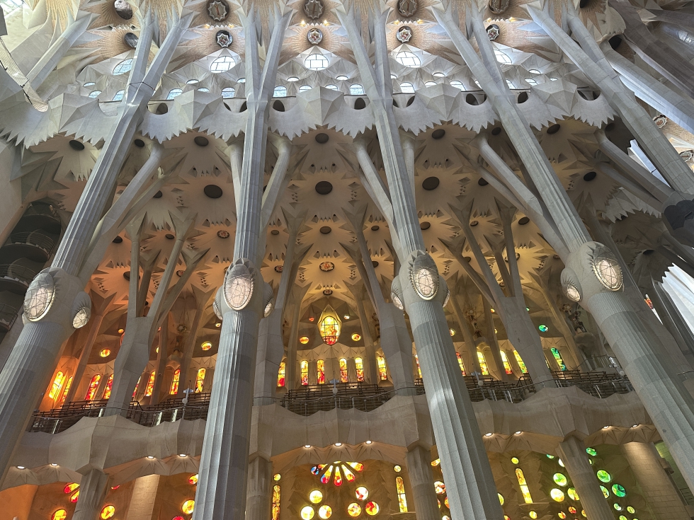 Uno de los elementos más disruptivos es la columna de doble giro, una invención única de Gaudí, que contribuye a distribuin mejor el peso hacia las bases, fiel a una geometría natural (como la de los troncos de los árboles), ya que estas columnas se ramifican en la parte superior para sostener las bóvedas, imitando las ramas de un árbol.