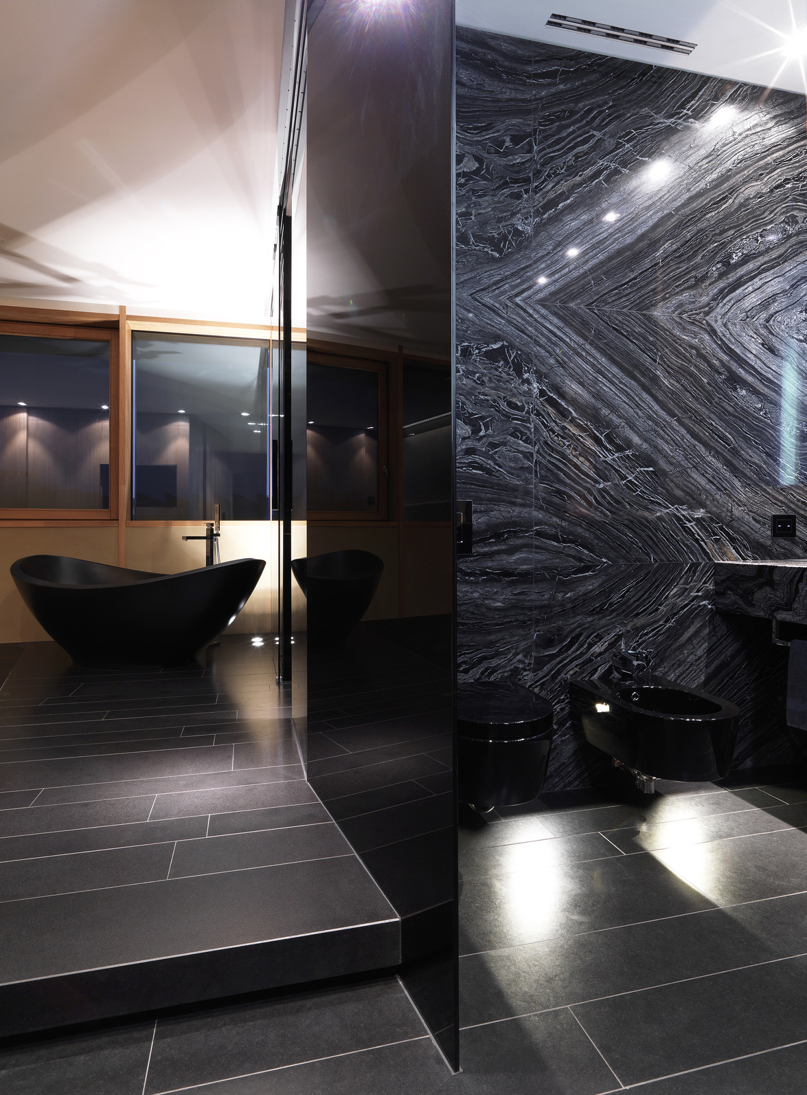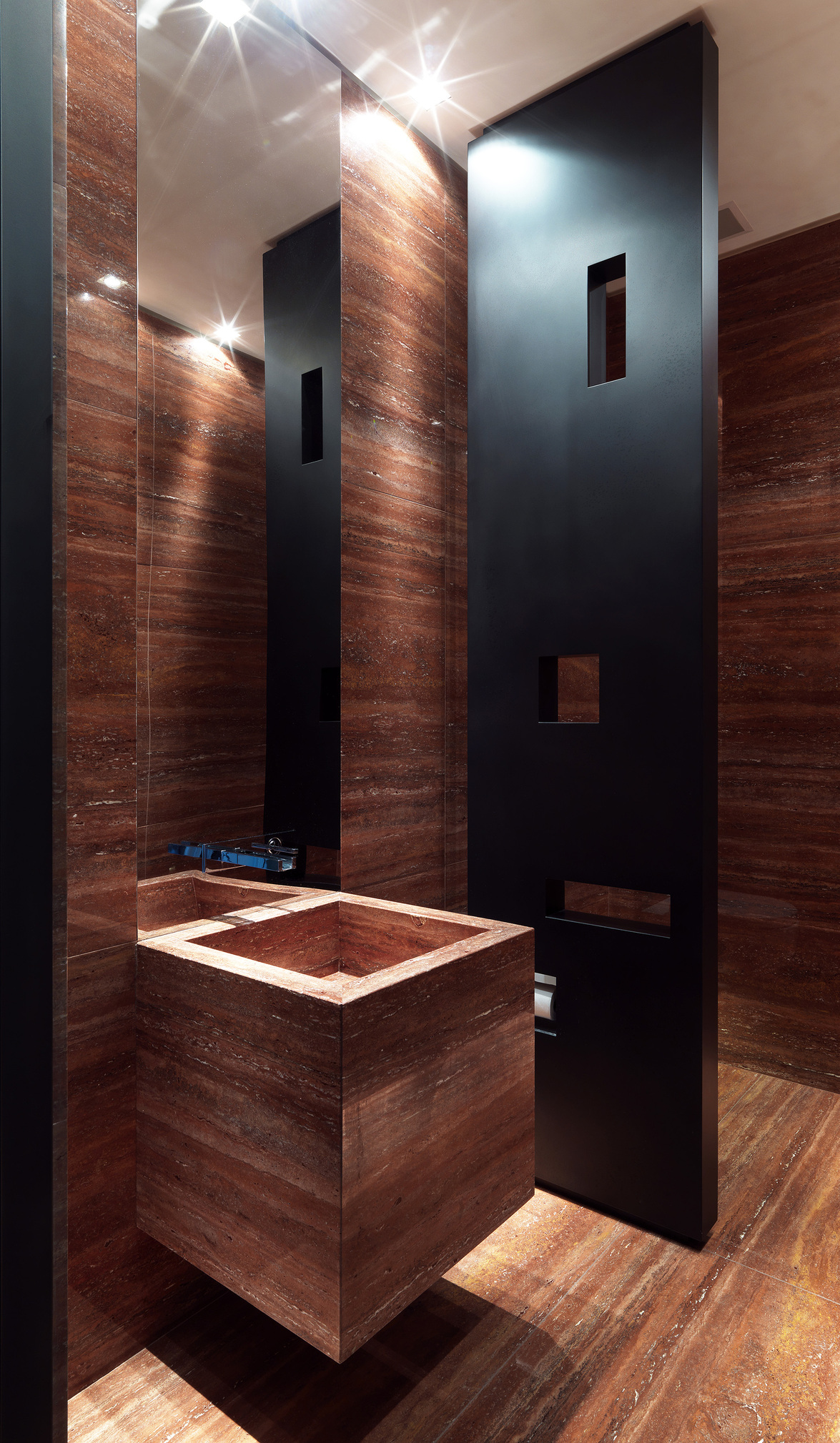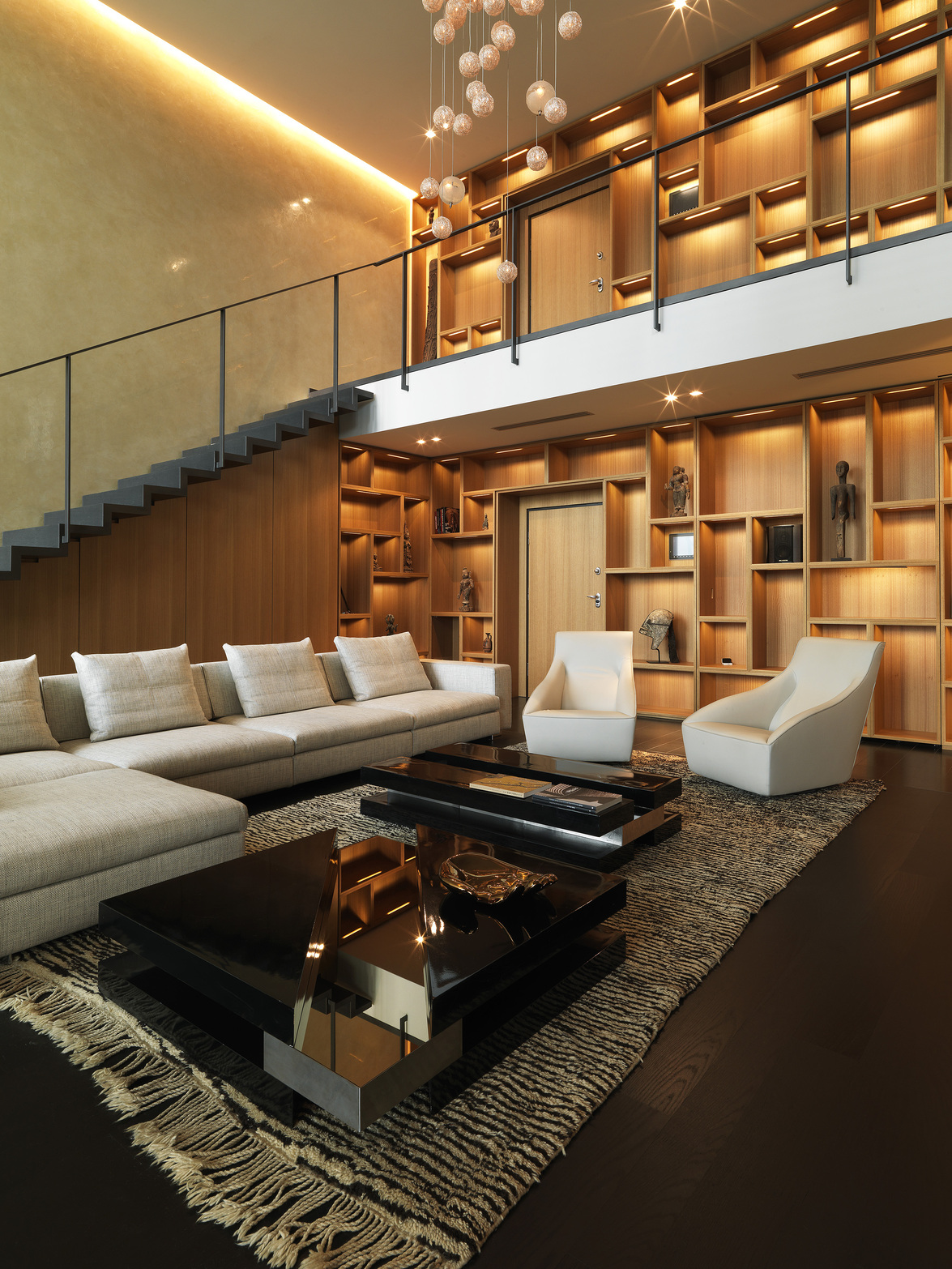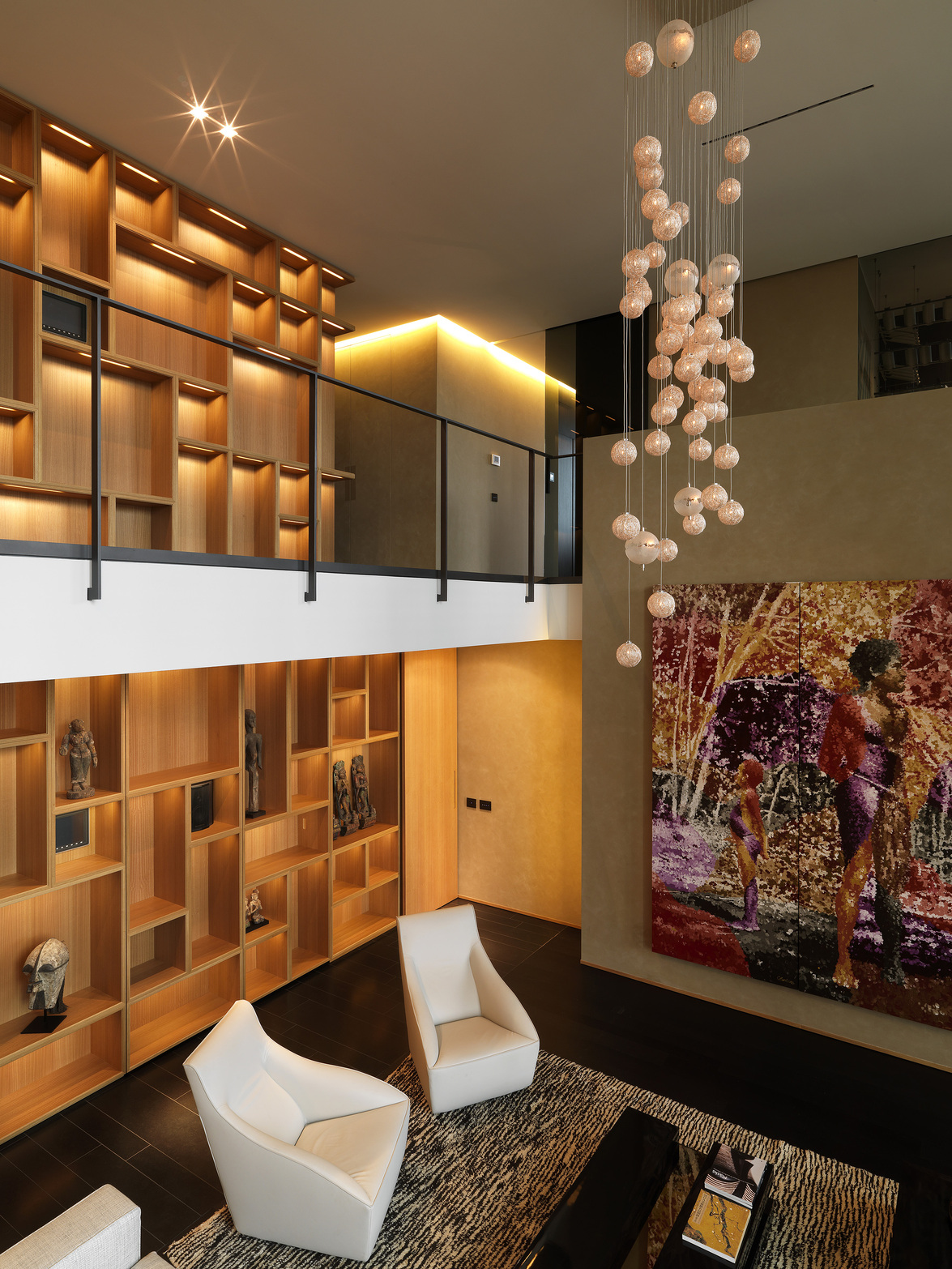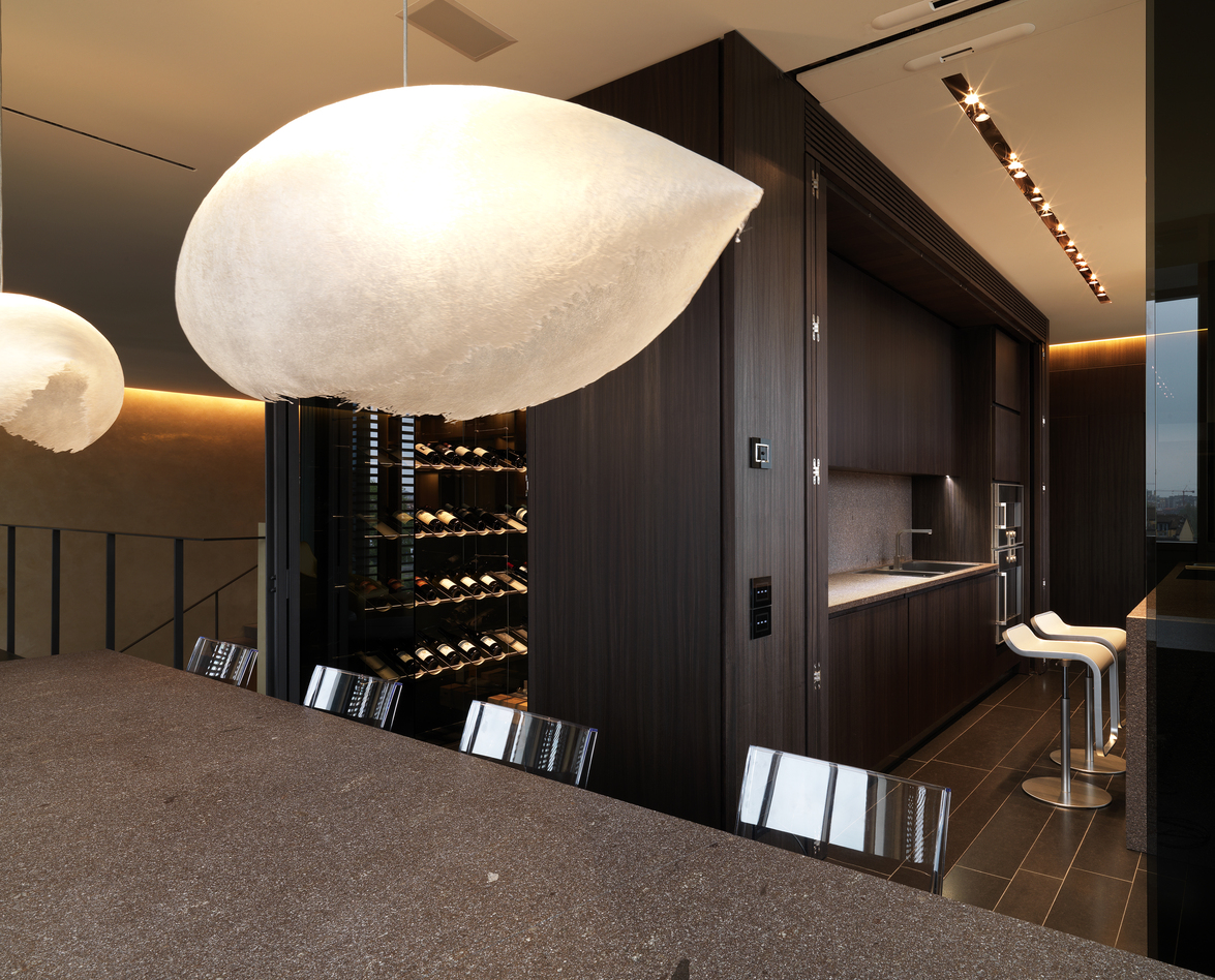 Los ambientes de doble altura se caracterizan por volúmenes monolíticos en un juego continuo de sólidos y vacíos, de partes fijas y abiertas, de transparencias y de elementos dinámicos ocultos que parecen algo pero en realidad son otra cosa: como el cuadro que se desvela, la televisión de plasma o la estantería que, a través de un “pasaje secreto”, oculta la sala técnica de los sistemas en su interior.