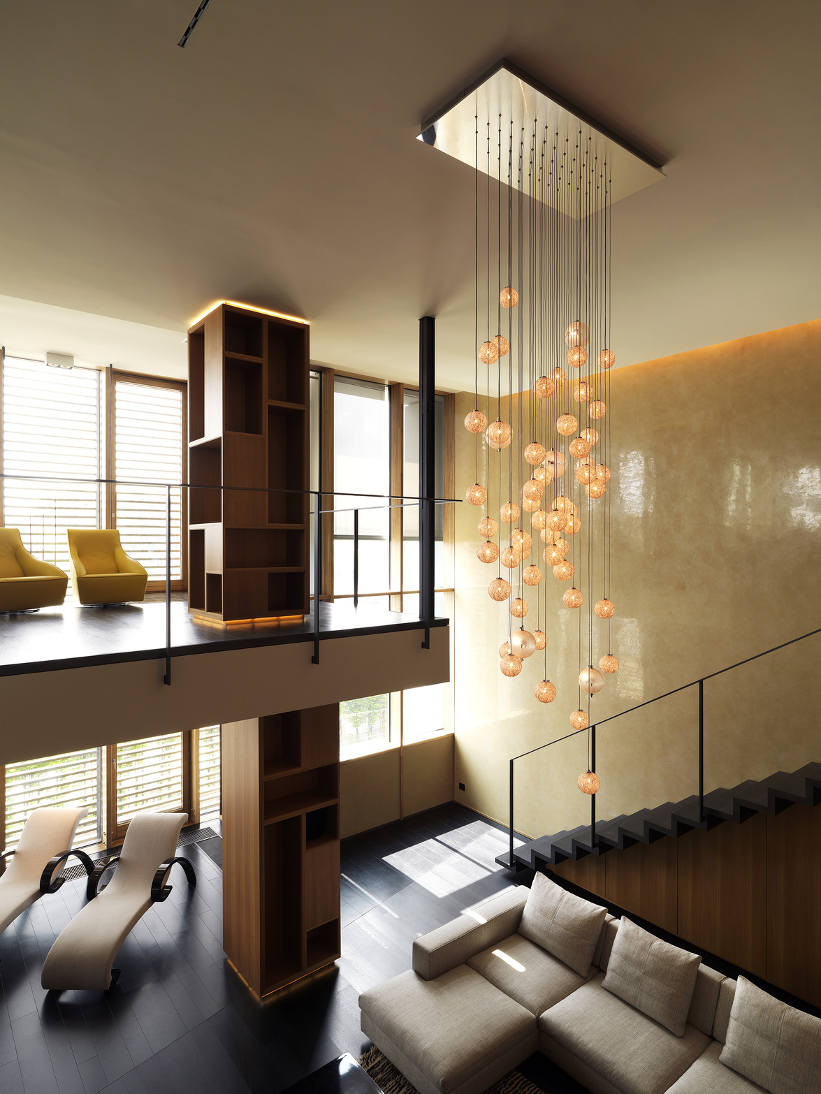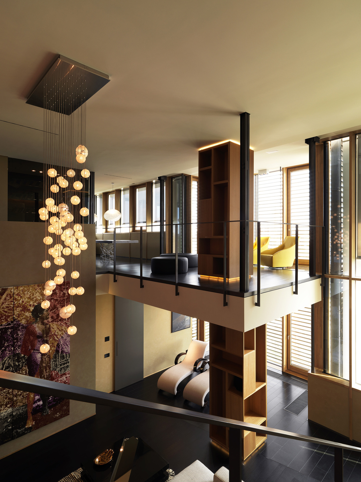 Las luminarias están diseñadas para acompañar la arquitectura de los interiores, mediante el uso de ranuras en los falsos techos, por ejemplo para iluminar la escalera o definir el volumen de la esquina del armario, o de focos retráctiles: o son verdaderas «esculturas» de luz, como el candelabro de la sala de estar o las luces de la mesa del comedor.