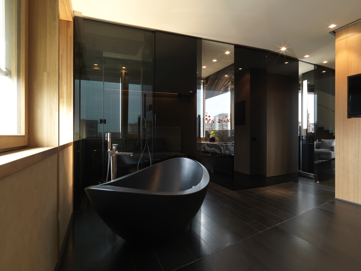 El acceso principal está sorprendentemente ubicado en el entresuelo y da a la sala de estar de abajo. La centralidad del entorno se enfatiza con la gran lámpara de araña de Catellani & Smith diseñada por el diseñador; a la derecha una escalera «suspendida» conduce a los grandes sofás de abajo y al área de dormir, a la izquierda un volumen monolítico con vista a la doble altura encierra diferentes espacios como el baño de visitas, un verdadero cofre del tesoro en travertino rojo, el sótano, concebida como una caja de cristal ahumado, y la cocina, caracterizada por una isla central en pórfido violeta. Los colores de la cocina se toman de la mesa del comedor que concluye el recorrido del salón y da al entrepiso acristalado, sobresaliendo por el salón.