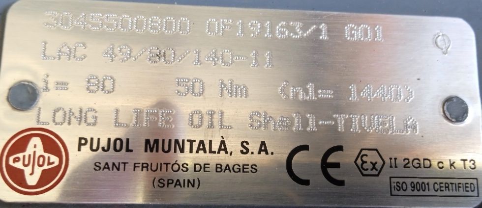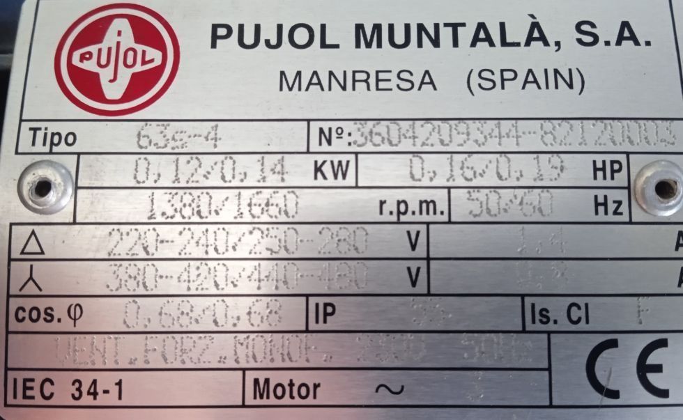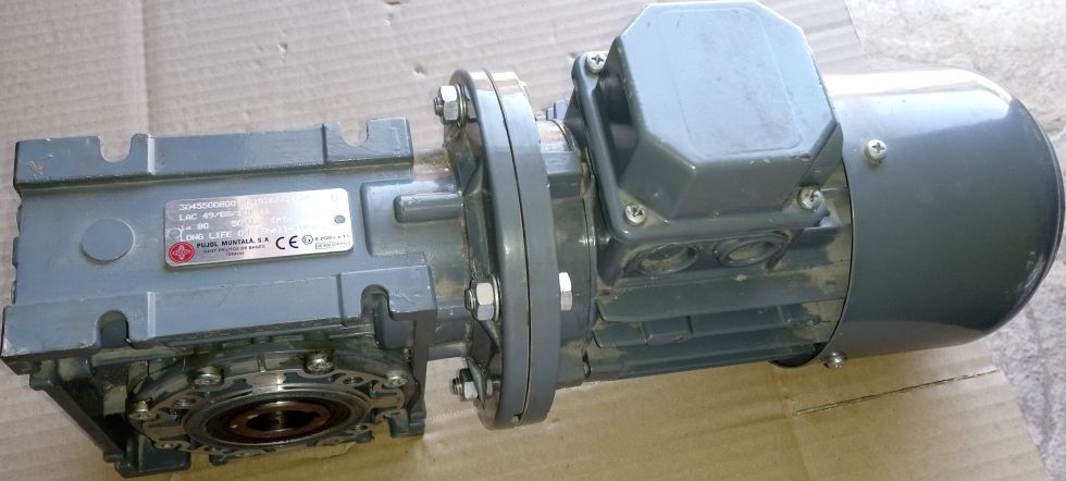 | Detalles | Vendo 4 Motor con Reductor PUJOL MUNTALA ► MOTOR TIPO: 63s-4 y REDUCTOR: ”LAC” 49/80/140-11 ► MOTOR TIPO: 63s-4 Nº: 3604209344-82120003 ► KW: 0.12 / 0.14 ►HP: 0.16/0.19 ► RPM: 1380/1660. ► Hz: 50/60 ► V: 220-240/250-280 ► A: 1.4 ► ʎ: 380/420/440-480 Y ► A: 0.8 ► COS 0.68/0.68 ► IP 55 ►Is. CI: F ►VENT. FORZ.MONOF. 2300 50HZ ► IEC: 34-1 REDUCTOR ”LAC” 49/80/140-11 (con caja de aluminio). ACOPLADO A UN MOTOR CON BRIDA SEGÚN NORMA DIN 42677 ►Potencias desde 0.07 hasta 2.6 kW ►Relaciones de reducción desde 5/1 hasta 100/1 ►Valores para n₁=1440 ►M² (max) (Nm): 90 ► ir: 80 ► P(kW): 32 ►n² (1/min: 18. Diametro: de salida reductor 25 Mm. Peso:9 Kg. |