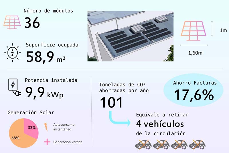 Esta instalación, consta de un total de 36 módulos en una superficie de 58.9 metros cuadrados, con una potencia de 9,9 kWp. Todo ello, supondrá un ahorro de más del 17 % en facturas y una reducción de más de un 30 % en gastos de energía al año.