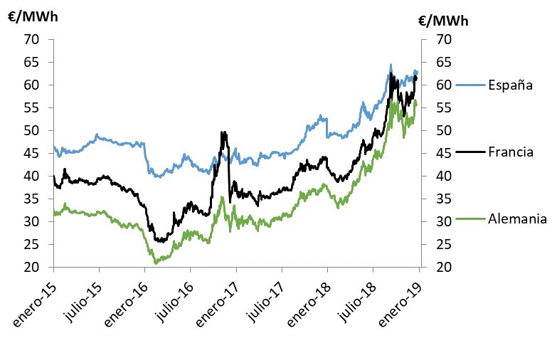 La cotización del futuro para 2019 del mercado eléctrico español a 21 de diciembre ha sido de 62,4 €/MWh, un 1,9% más caro que hace un mes, y un 11,7% superior a la cotización del mercado alemán, que ha sido de 55,8 €/MWh.
