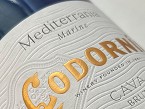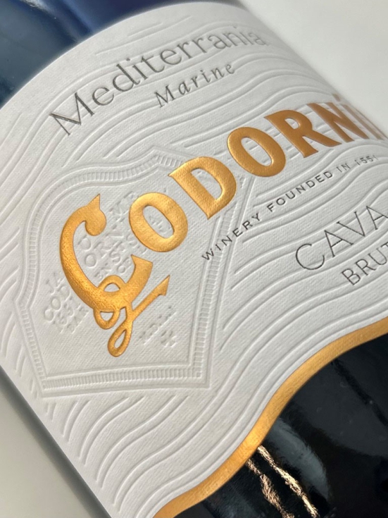 Codorniu Mediterrania Marine Cava Bru (Gráficas Varias, S.A.U): Etiqueta y packaging evocador para cava, con relieves y diseño marino.