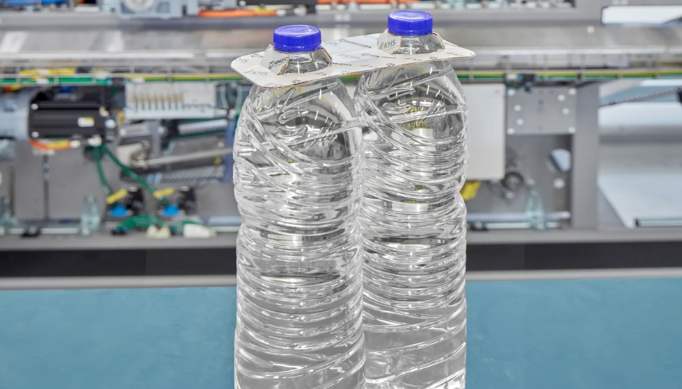 Sistema de embalaje 100% cartón para agrupar botellas (Hinojosa Packaging Graphicsleader & KHS): Clip de cartón minimalista reciclable que sustituye el film plástico, optimizando la logística y reduciendo emisiones.