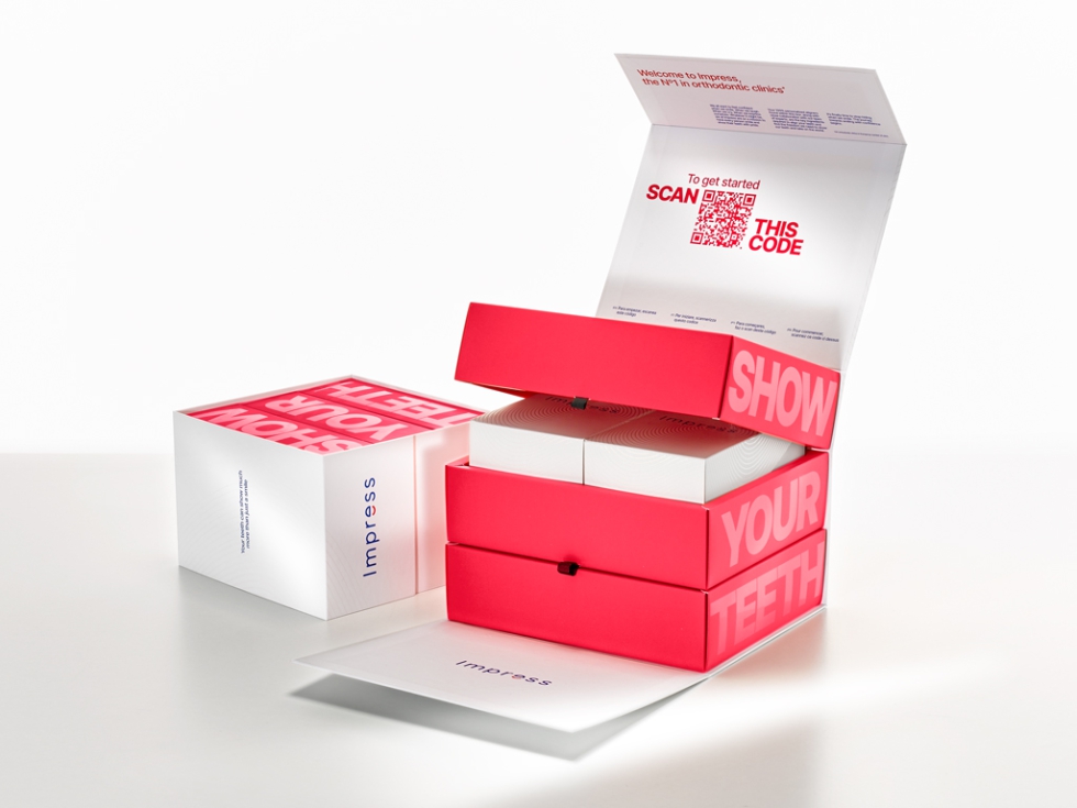 Impress (Garrofé): Estuche premium para un tratamiento completo de ortodoncia invisible, con acabados mate y detalles holográficos.