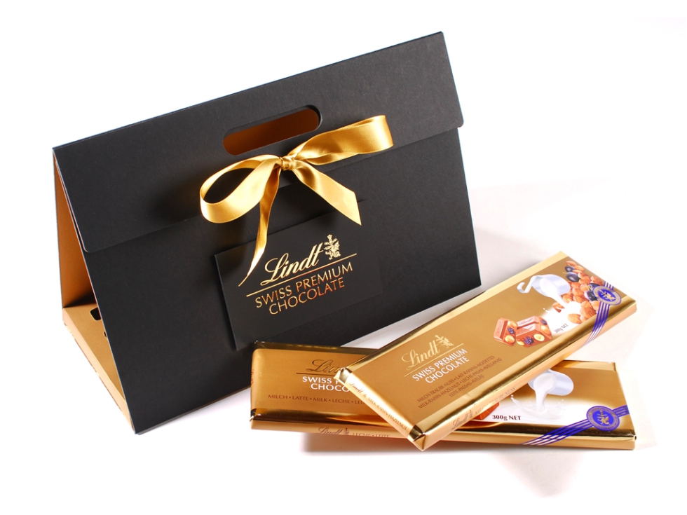 Gift Pack Lindt (Garrofé): Estuche triangular para chocolates Lindt, inspirado en un bolso y acabado negro mate con detalles dorados que transforma el regalo en una experiencia de lujo.