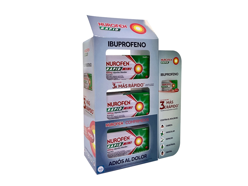 Nurofen Rapid, caja expositora (Miralles Cartonajes, S.A.): Caja de envío y expositor para farmacias, con diseño funcional y seguro.