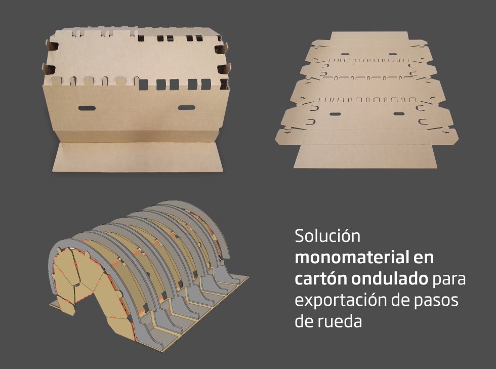 Embalaje circular para exportación de pasos de ruedas (DS Smith Tecnicarton): Solución monomaterial para piezas de automoción, con protección y eficiencia logística.