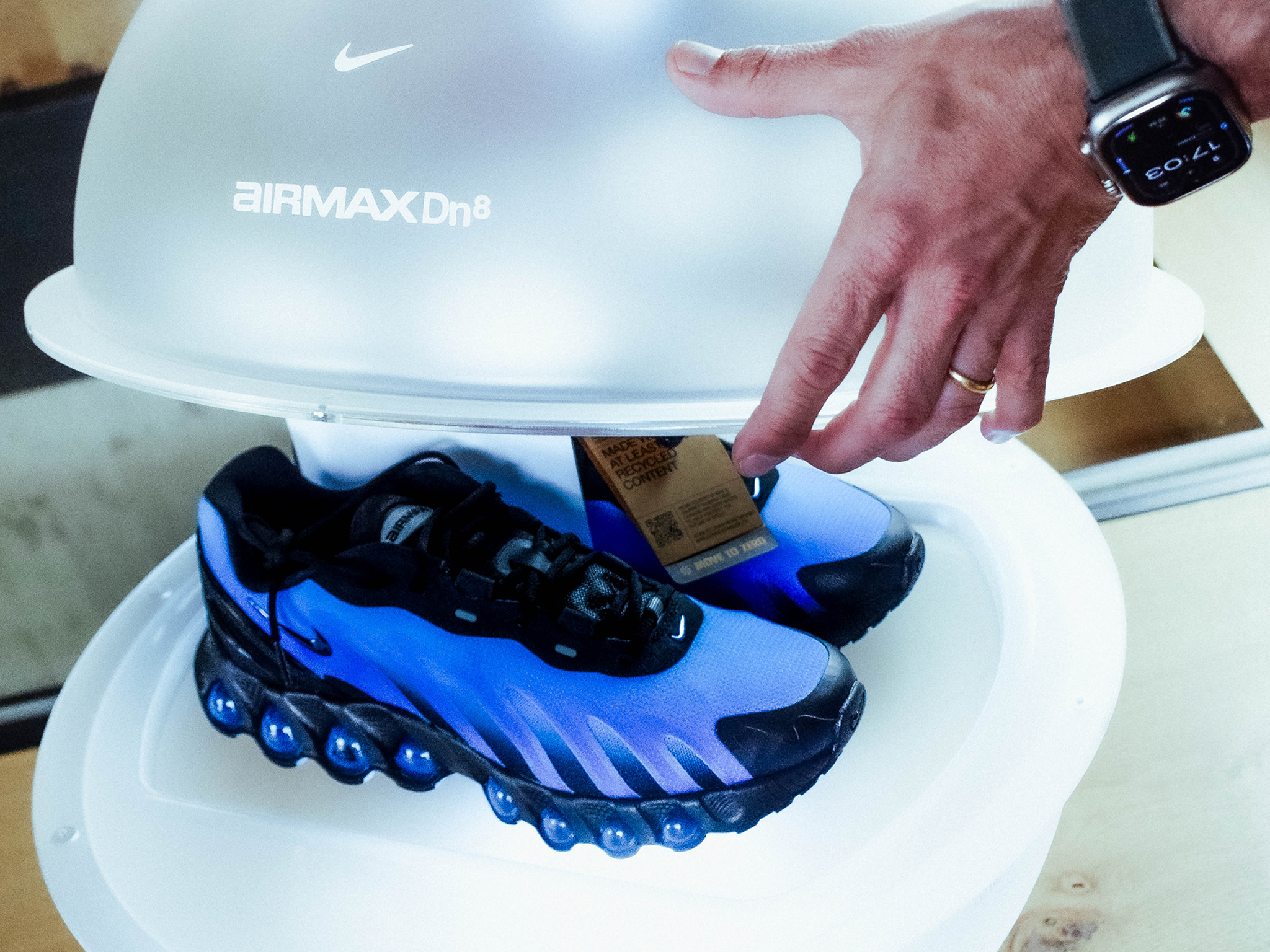 Nike Air Max DN8 Sphere (B-Bruce): Packaging esférico iluminado como caja de zapatillas regalo para influencers, reutilizable como lámpara decorativa.