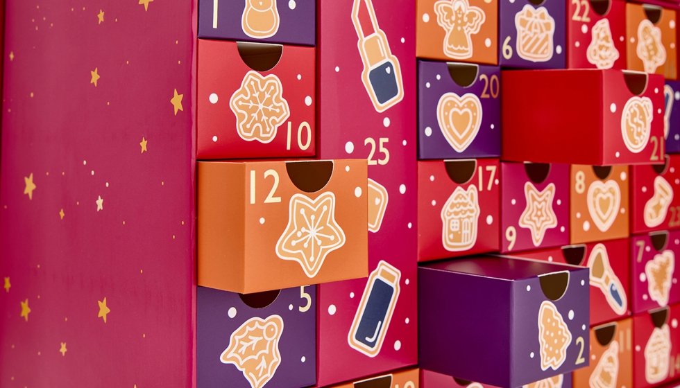 El 25 Days of Beauty Advent mantiene la estructura de caja tipo bombón, con cartoncillos en colores variados y números en dorado, mientras que The Luxury Beauty Advent evolucionó desde un concepto de bola de nieve a la escena de pista de hielo final, adaptándose a las necesidades de durabilidad y sostenibilidad del cliente. La combinación de barniz UV y estampado dorado se aplicó de manera estratégica para que las cajas fueran reciclables, aunque suficientemente atractivas para conservarlas como objetos de colección.