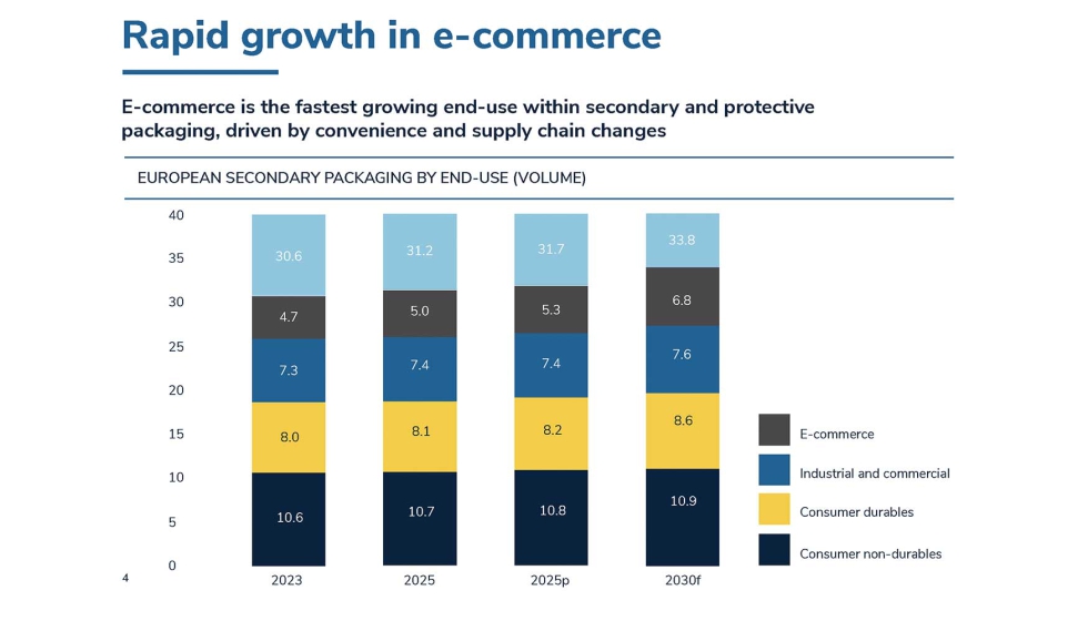 El comercio electrónico se ha convertido en el segmento de mayor crecimiento dentro del embalaje secundario, por delante de los bienes de consumo duradero, no duradero y del embalaje industrial. Los datos de Smithers indican que los volúmenes de embalaje secundario vinculados al e-commerce en Europa aumentarán un 45% hasta 2030, frente a un crecimiento del 10,5% en el conjunto del mercado. En términos de volumen, se pasará de 4,7 millones de toneladas en 2023 a 6,8 millones en 2030, mientras que el total del embalaje secundario crecerá de 30,6 a 33,8 millones de toneladas. Este cambio desplaza la demanda desde los lineales del supermercado hacia almacenes, operadores logísticos y sistemas de devolución, con impacto directo en la inversión en cartón ondulado, las tasas de responsabilidad ampliada del productor y las infraestructuras de reciclaje.
